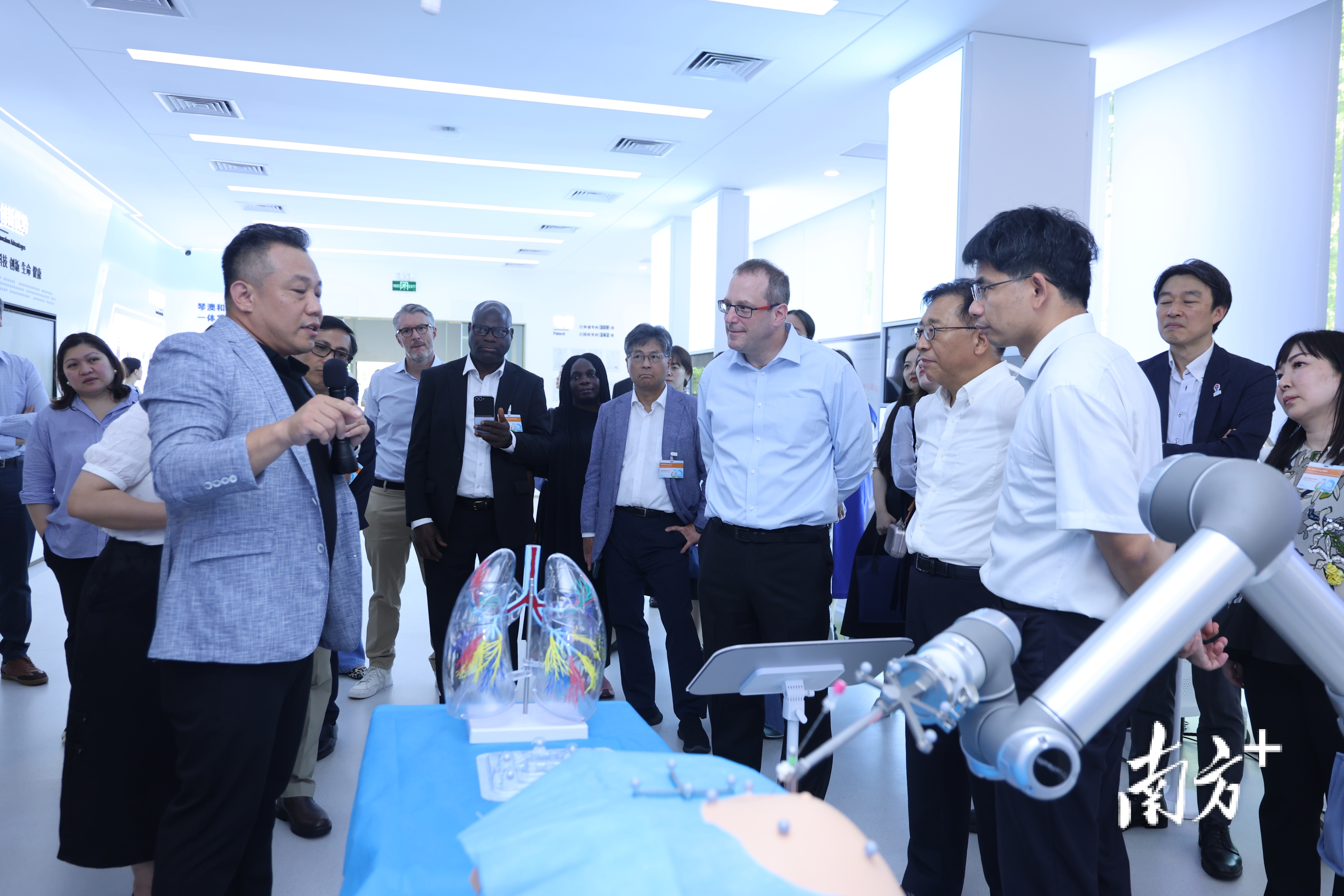 在真健康公司的展厅内,以色列驻港总领事蓝天铭体验了高精度穿刺机器人辅助手术系统。在工作人员指导下,他操作穿刺针精准刺入模拟胸部模型的病灶区域,机器屏幕实时显示穿刺角度、深度等关键数据。体验结束后,蓝天铭还与技术人员探讨了临床应用前景及技术推广可能性。